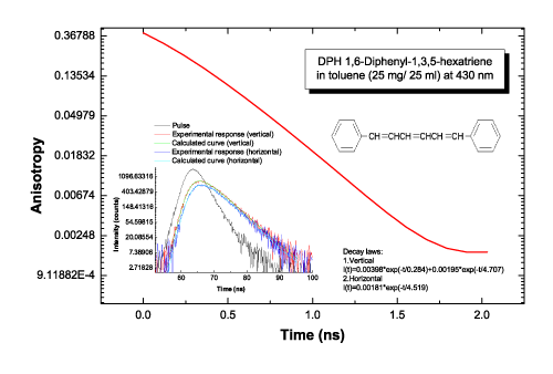 The graph depicts the anisotropic decay of 1,6-Diphenyl-1,3,5-hexatriene in toluene (25 mg/ 25 ml) at 430 nm. Experimental data (pump pulse and sample responses) were imported into Origin as ASCII data. To deconvolve experimental responses, user-defined fitting functions were created. They were defined as first and second order exponential decays convolved with the experimental pulse response. Fluorescence lifetimes and sample were obtained by channel (memory units). Then the decay of emission anisotropy was calculated and plotted using Origin's function graph template. Memory units were converted to time units. All decays (fluorescence and anisotropy) were plotted on a natural log scale.