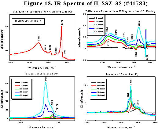 This layout page presentation includes four graphs depicting mid-range IR spectra of the acid form of zeolite SSZ-35. The four graphs utilize custom annotations including rotated text labels and arrows denoting peak positions, as well as sub- and superscripted text. To facilitate accurate arrangement of the graphs on the page, the layout page includes a grid and a "snap to grid" option. Shortcut menu commands in the layout page provide fast access to the selected graph's source window, so that you can easily fine-tune the layout page presentation.