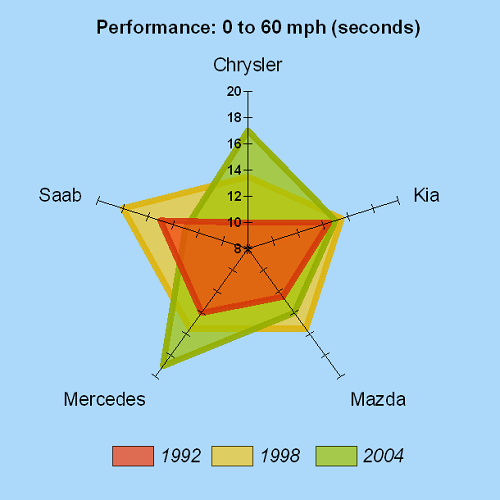 This plot type is ideal for displaying and comparing multivariate data. A custom dialog is provided for control of axes, including the ability to set each axis to a different scale.