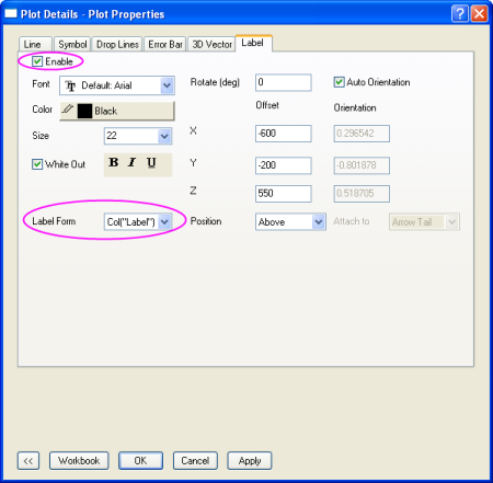 Description: This graph shows the topology of eastern California as a 3D colormap surface. The plot is overlaid with 3D scatters to highlight two special locations in the terrain. The point label is enabled for 3D scatters and can be customized in the Label tab of the Plot Details dialog. Additionally, lines which connect the data points to the labels are added. This line has an annotation effect when the 3D graph is being transformed or rotated. To add this line, click on the graph to make it active and run the following command in the script window: set %C -ql 5;