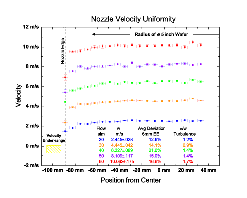 Note: The graph was submitted by Dr. James Gardner, an Origin user. The data for the graph was obtained by flowing a gas through a nozzle and measuring the velocity as a function of the experimental parameter flow. The position of the probe used for the measurements was computer controlled to provide the highest degree of accuracy.