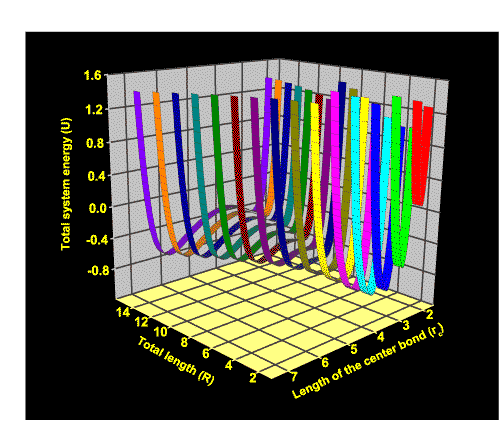 The graph displays potential surface calculations for a 4-Cu-atom chain. R is the total length of the chain. Each ribbon in the graph represents the potential profile (U) at a particular R with different center bond length rc. It can be seen that as we pull the chain longer and longer, the bond breaks. This is represented by two energy minima along the energy profile at longer Rs. One of those minima corresponds to the breaking of the center bond; the other one corresponds to the breaking of the side bonds.