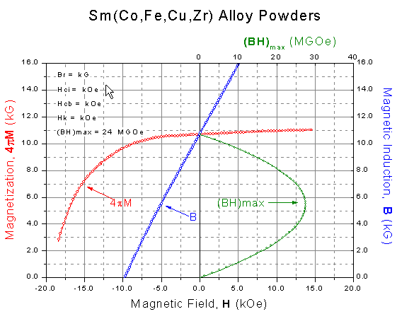 Data from magnetic analysis of alloy powders is displayed in this multilayer presentation. The magnetization (red) and magnetic induction (blue) are plotted in one layer with a common X axis. The two Y axes on the left and the right provide scales for these two quantities. The quantity BHmax (green) is plotted in a second layer that is linked to the first layer through a common Y axis (right side). This second layer has a separate X axis that spans the top right-half of the graph. Colored titles are used effectively in this presentation to denote the axes that correspond to each quantity.